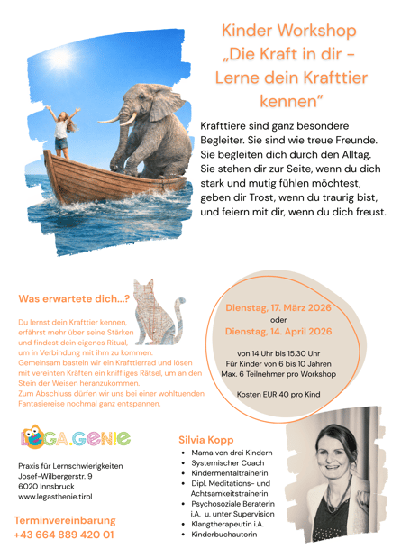 Silvia begleitet Kinder einfühlsam dabei, ihre inneren Stärken zu entdecken, Gefühle bewusst wahrzunehmen und einen positiven Zugang zu sich selbst zu entwickeln. In einem geschützten und erlebbaren Rahmen lernen die Kinder, ihre Bedürfnisse zu erkennen und mit Herausforderungen achtsam umzugehen.