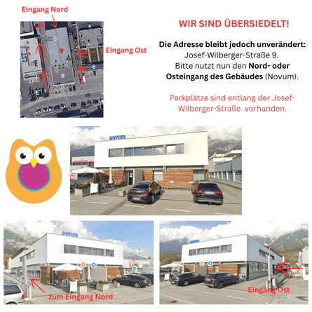Gratis Parkplätze sind entlang der Josef-Wilberger-Straße vorhanden. Bitte beachtet, dass es sich bei den Parkplätzen direkt vor dem Novum um private Abstellplätze handelt, die von uns nicht genutzt werden dürfen.
